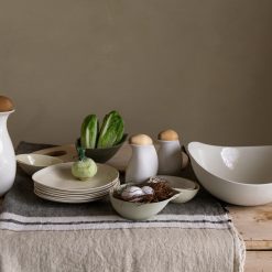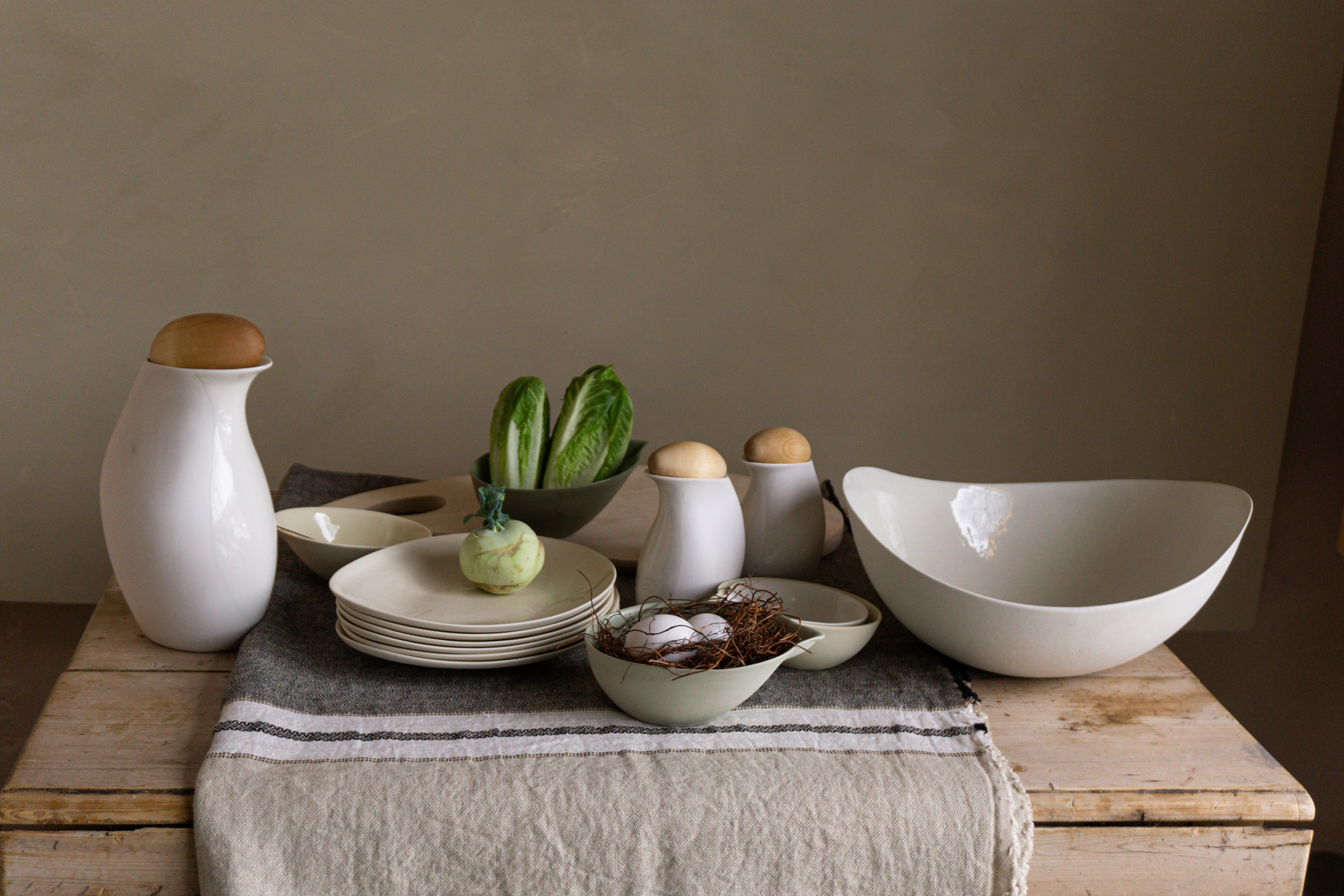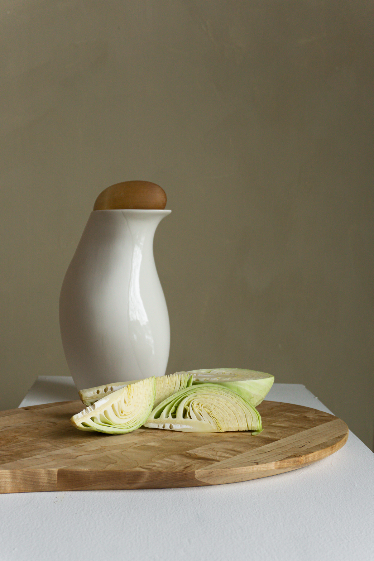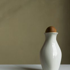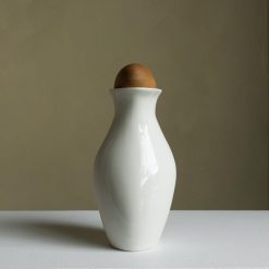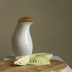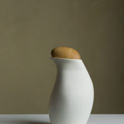 Vannkannen har en særegen, organisk form som minner om en klassisk amfora-krukke sett forfra. Korken er hånddreid i bjørk og tilfører kannen det lille ekstra.