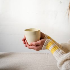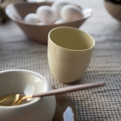Koppene i KRUM-serien er laget i gjennomfarget porselen og glasert med transparent glasur inni og rundt kanten du drikker av. Det gir en behagelig, fløyelsmyk overflate å holde i. Den finnes i mange farger og tre størrelser; Tekopp, Kaffekopp og Espressokopp. Kan vaskes i oppvaskmaskin.