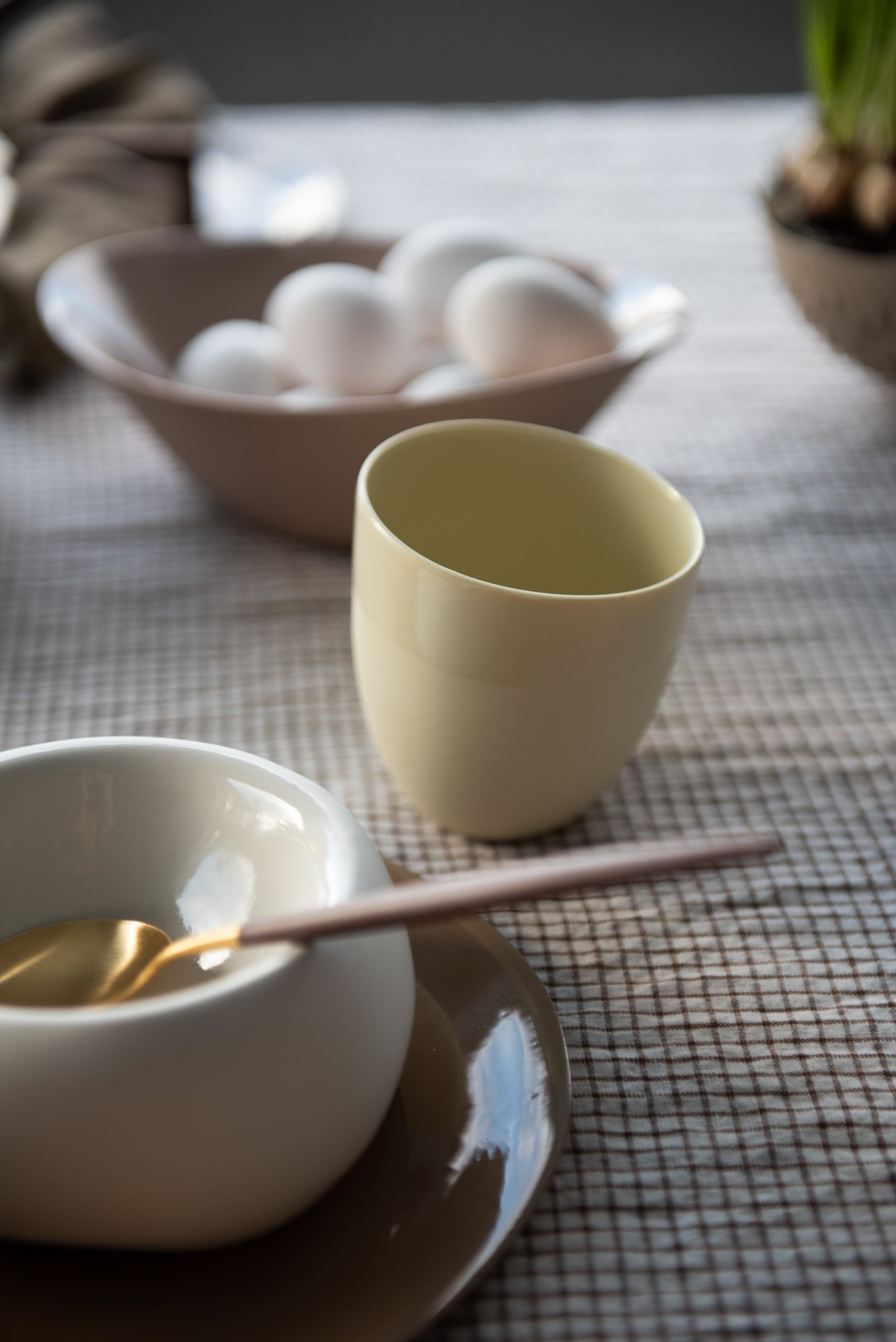 Vi støper produkter i gjennomfarget porselen. Det betyr at vi blander inn fargepigmenter i selve materialet i stedet for i glasuren utenpå. Denne metoden gjør at du vil kunne oppleve fargemarmoreringer, særlig i de mørke nyansene. Våre produkter formes av hender og håndteres manuelt gjennom alle produksjonsledd. Litt variasjon i farge, størrelse og fasong er derfor helt naturlig på vårt porselen. Det er det som gjør hvert produkt unikt. Lær mer om vår produksjon >