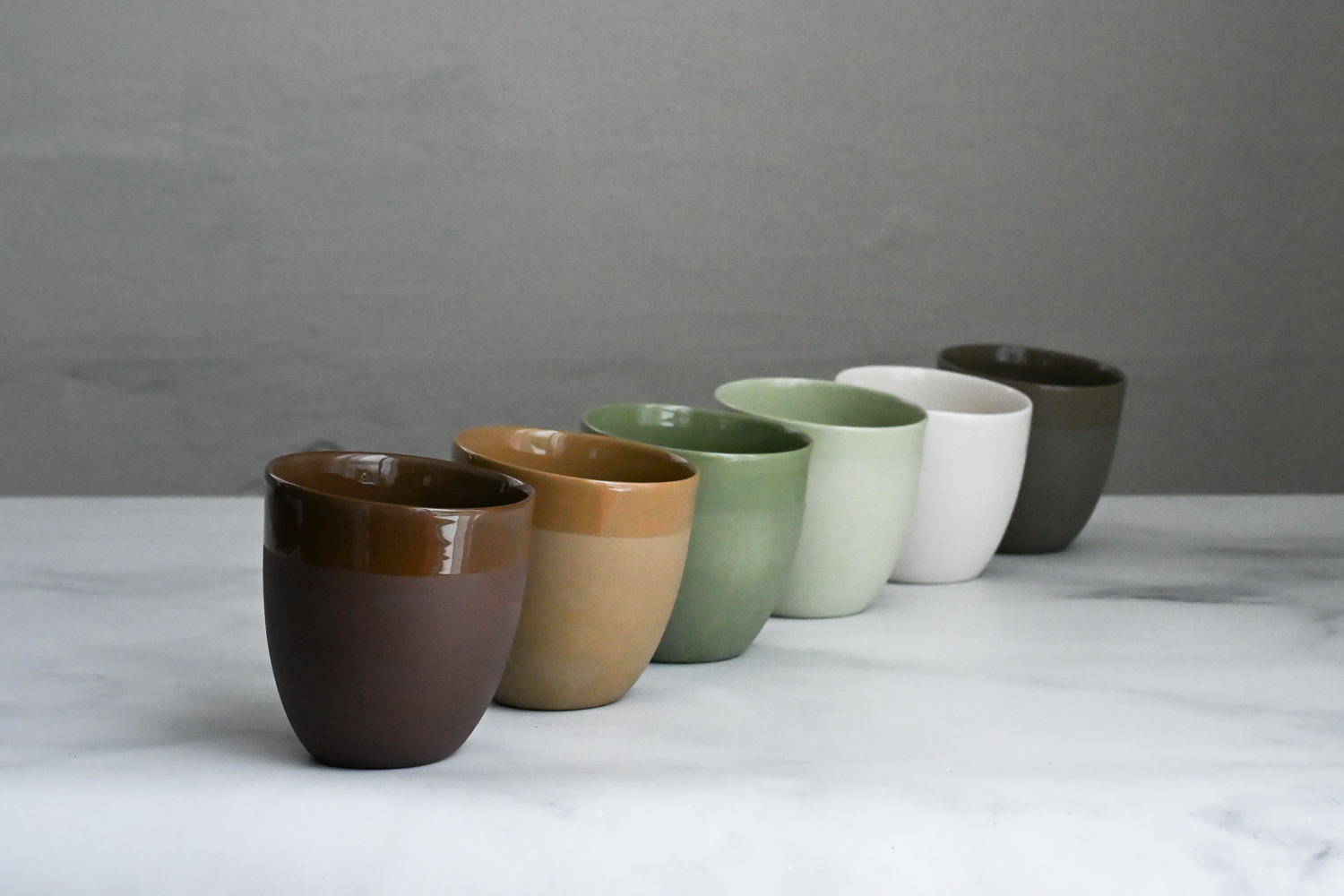 Koppene i KRUM-serien er laget i gjennomfarget porselen og glasert med transparent glasur inni og rundt kanten du drikker av. Det gir en behagelig, fløyelsmyk overflate å holde i. Den finnes i mange farger og tre størrelser; Tekopp, Kaffekopp og Espressokopp. Kan vaskes i oppvaskmaskin.