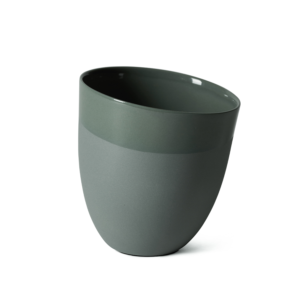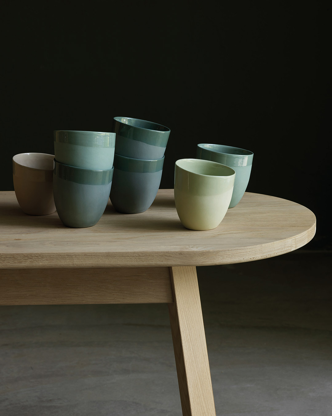 En håndlaget kopp i gjennomfarget porselen som ligger godt i hånden og har en behagelig, fløyelsmyk overflate. Glasert med transparent glasur inni og rundt kanten du drikker av.