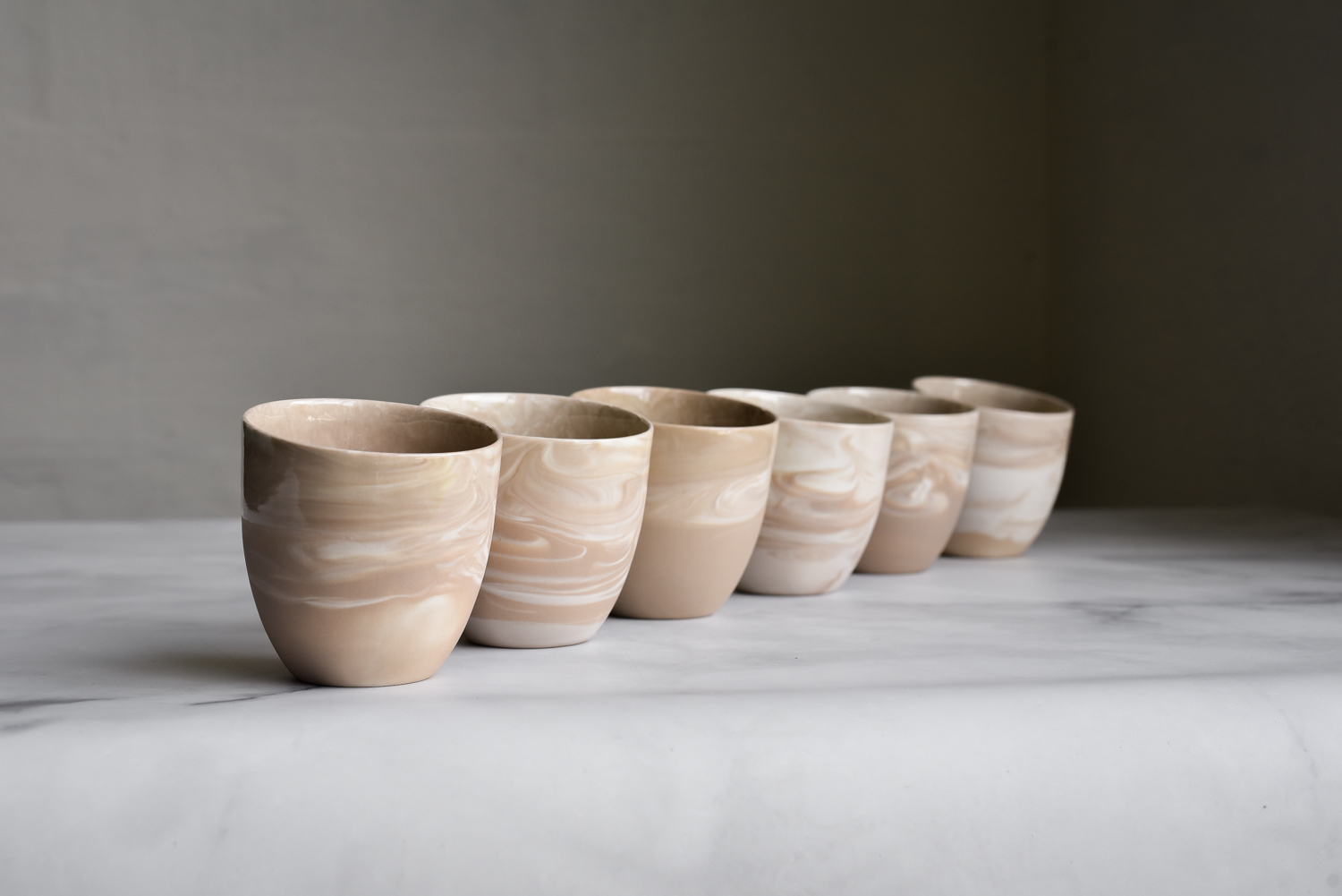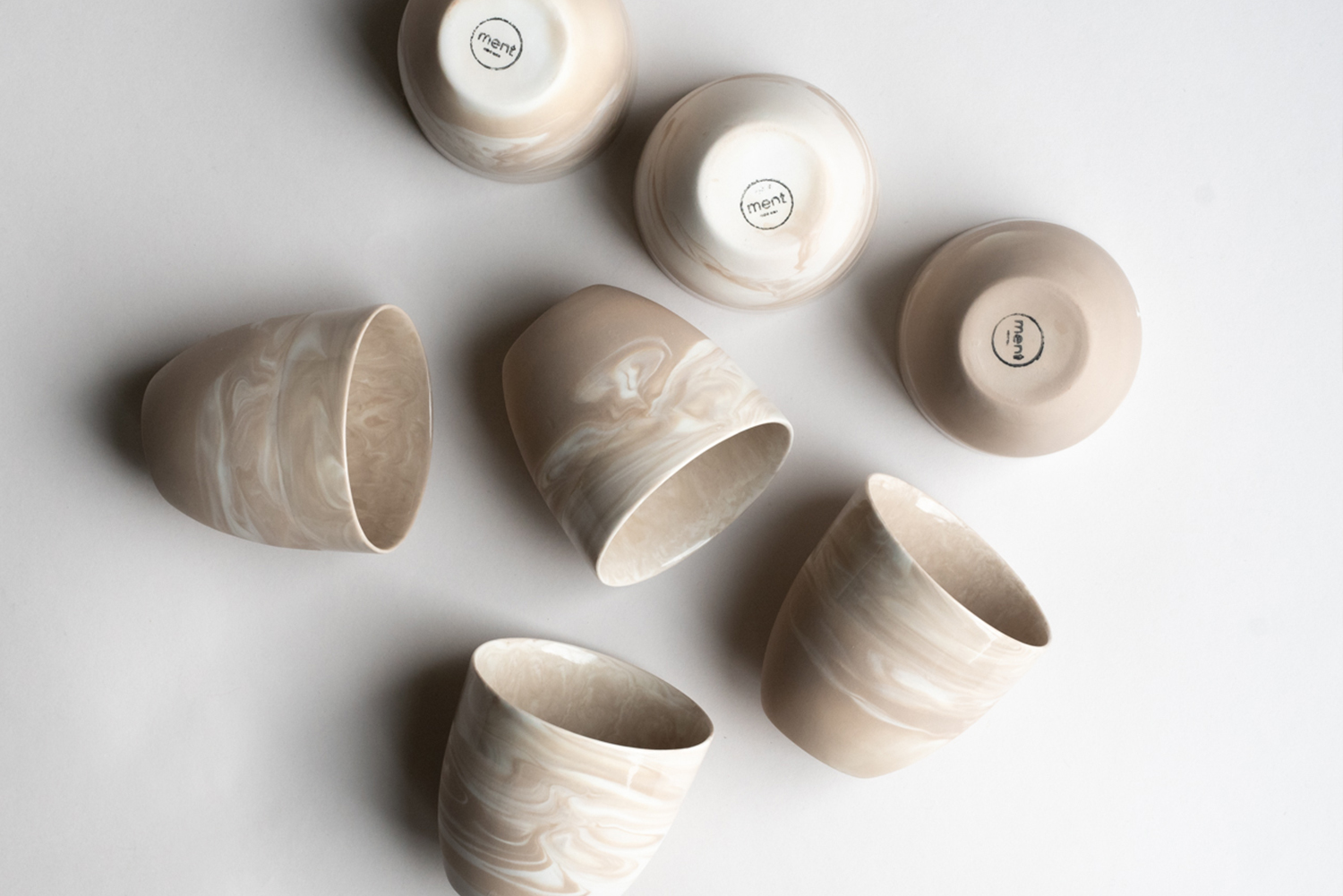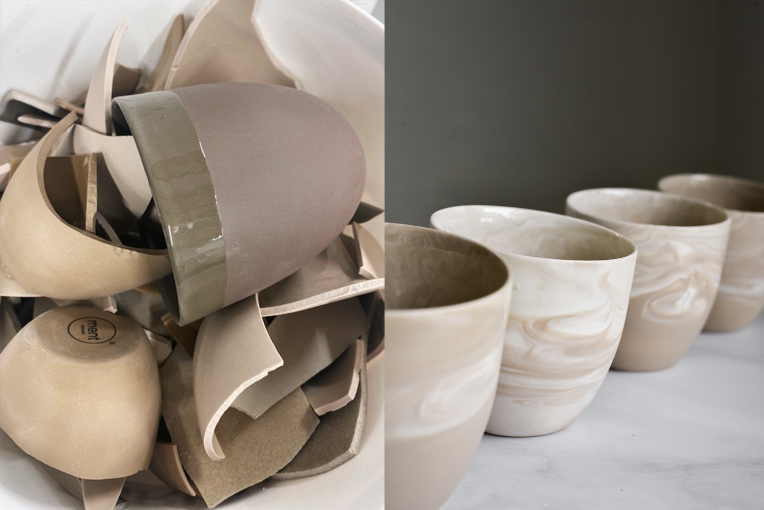 Vi er de første i vår bransje til å gjenbruke knust porselen i nye produkter, og det første produktet vi lager på denne måten er vår besteselger; KRUM kaffekopp. Fargen har vi valgt å kalle Latte, der den brune fargen er resirkulert brunt porselensmateriale og den hvite fargen er nytt materiale.