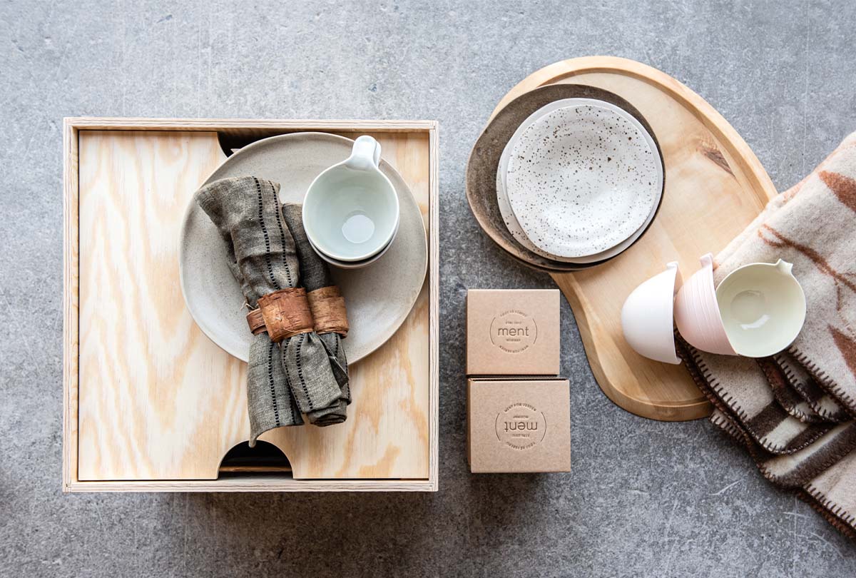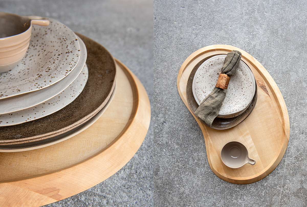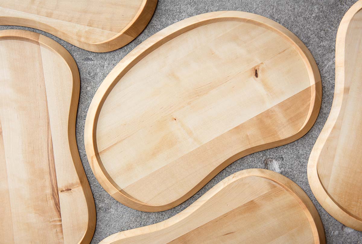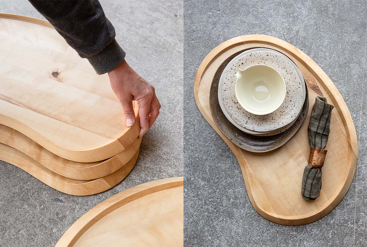 Som alternativ til bord har vi utviklet et spisebrett, eller Etafat som det heter i Gudbrandsdalen. Formen er inspirert av Kjuke som vokser på fjellbjørk. Etafjøl er laget i Bjørk fra Gudbrandsdalen og behandlet med nøytral olje.