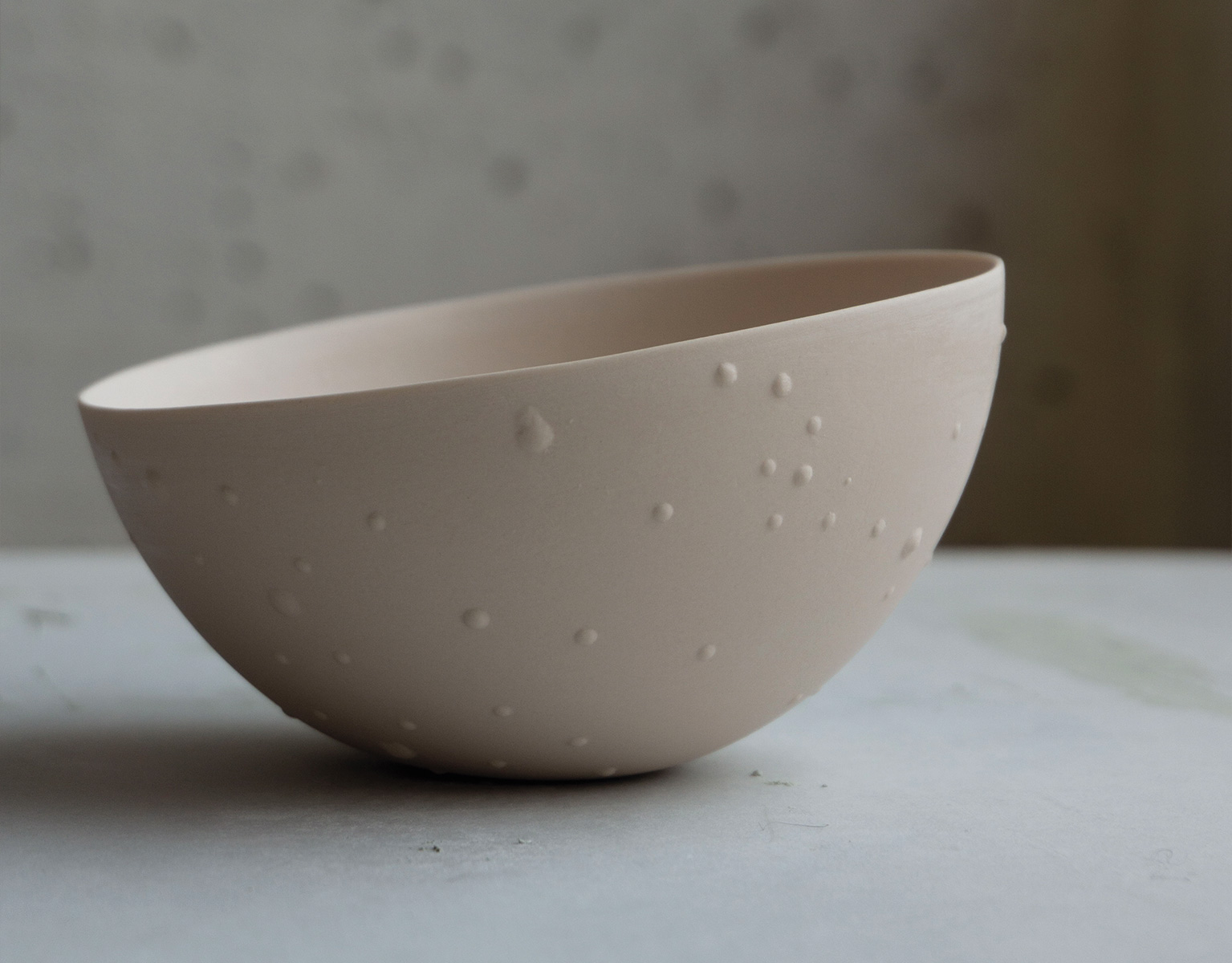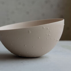 Prikkebollen produseres i gjennomfarget porselen og glaseres innvendig med transparent glasur. Utsiden er ubehandlet og dette gir en delikat, taktil overflate med de små prikkene på.