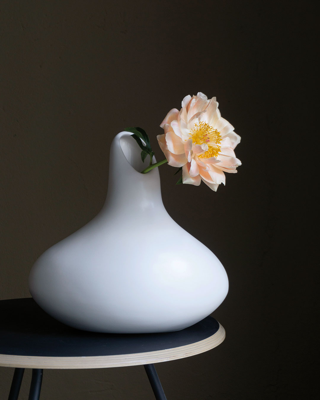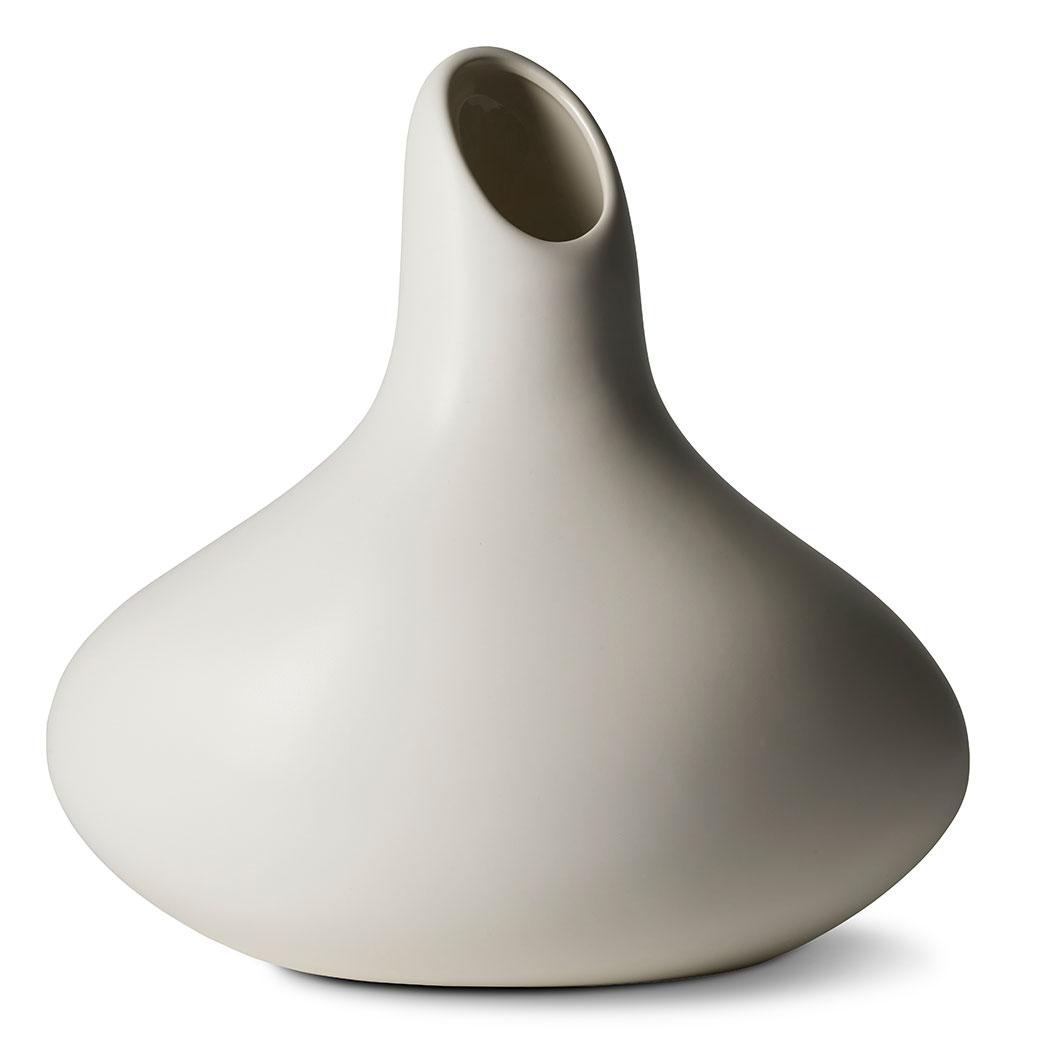 Denne vasen er håndlaget i keramikk og glasert med matt glasur utenpå og blank glasur inni. Det tar 7 dager fra et nytt produkt blir støpt til den har gått igjennom alle prosesser i produksjonen med vask av kanter og overflater, råbrann, glasering og glasurbrann.
