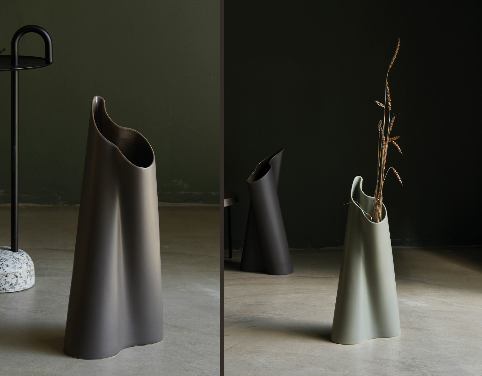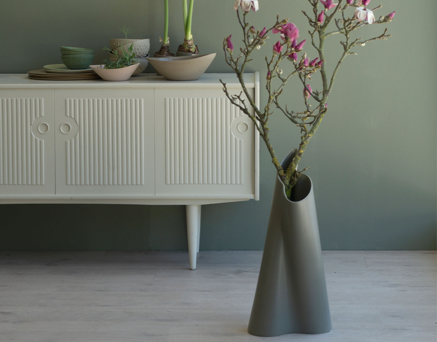 Denne vasen håndlages i keramikk og glaseres med matt glasur utenpå og blank glasur inni. Det tar 7 dager fra et nytt produkt blir støpt til den har gått igjennom alle prosesser i produksjonen med vask av kanter og overflater, råbrann, glasering og glasurbrann.