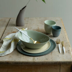 Vi støper produkter i gjennomfarget porselen. Det betyr at vi blander inn fargepigmenter i selve materialet i stedet for i glasuren utenpå. Denne metoden gjør at du vil kunne oppleve fargemarmoreringer, særlig i de mørke nyansene. Våre produkter formes av hender og håndteres manuelt gjennom alle produksjonsledd. Litt variasjon i farge, størrelse og fasong er derfor helt naturlig på vårt porselen. Det er det som gjør hvert produkt unikt. Lær mer om vår håndverksproduksjon her >