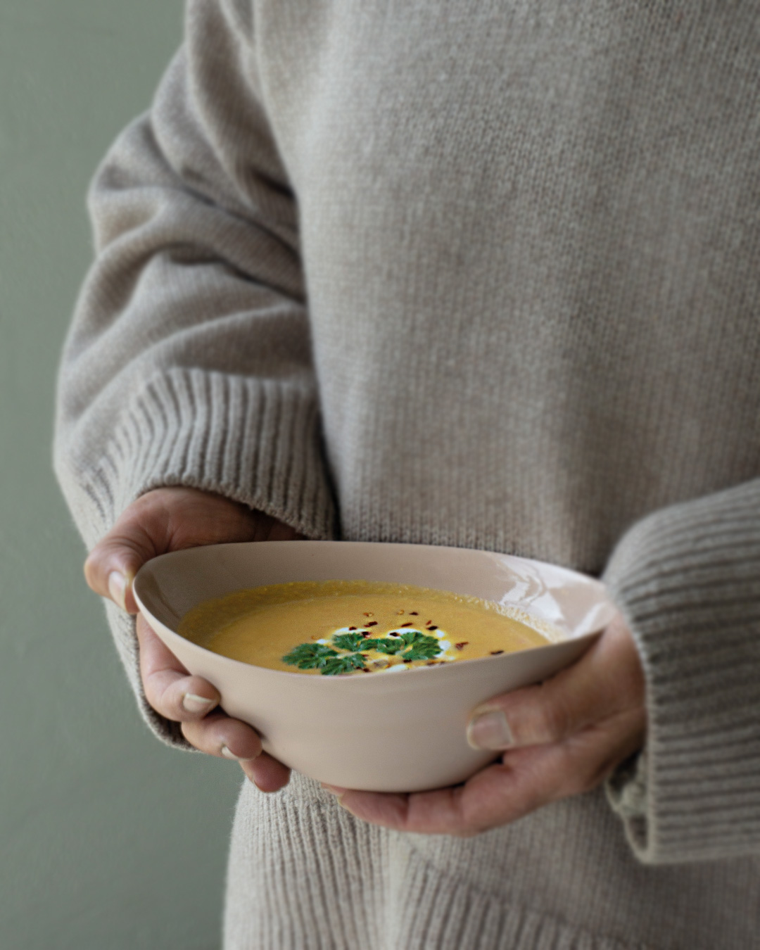 En vakker suppeskål med et organisk design. Skålen er laget i gjennomfarget porselen og er glasert med transparent glasur inni. Perfekt i kombinasjon med Krum tallerkener og kan brukes til alt fra dessert, supper, salat eller som en skål til snacks.