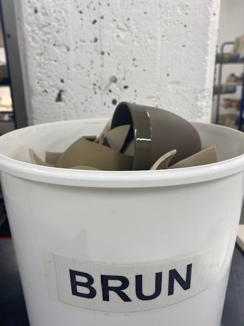 Vi må sortere alt svinn på farge før vi knuser og sirkulerer porselensmaterialet. For Krum resirkulert kaffekopp, Latte har vi knust svinn av våre ulike brunfarger.