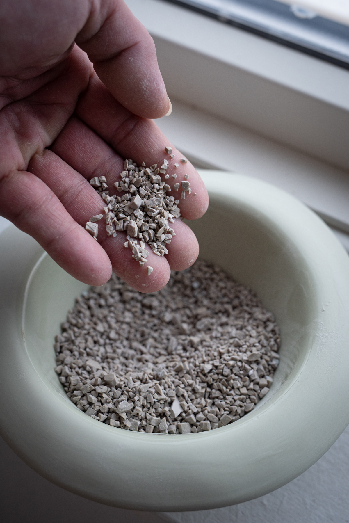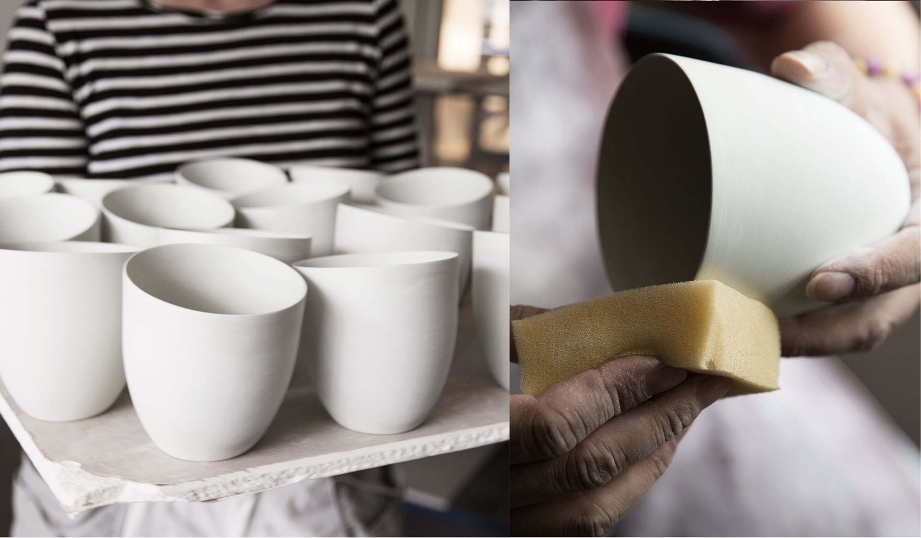 Koppene er håndlaget og denne prosessen er ekstra krevende da vi først må sortere, knuse og sikte gjenbrukt porselensmateriale.