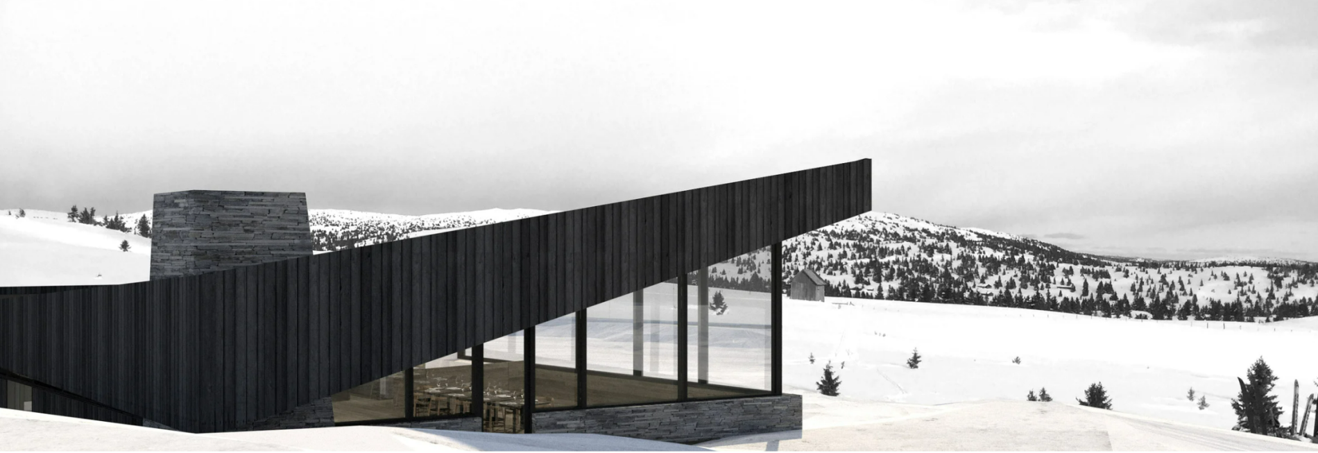 Om kvelden fremstår restauranten som en lun og inviterende lomme i det store landskapet.